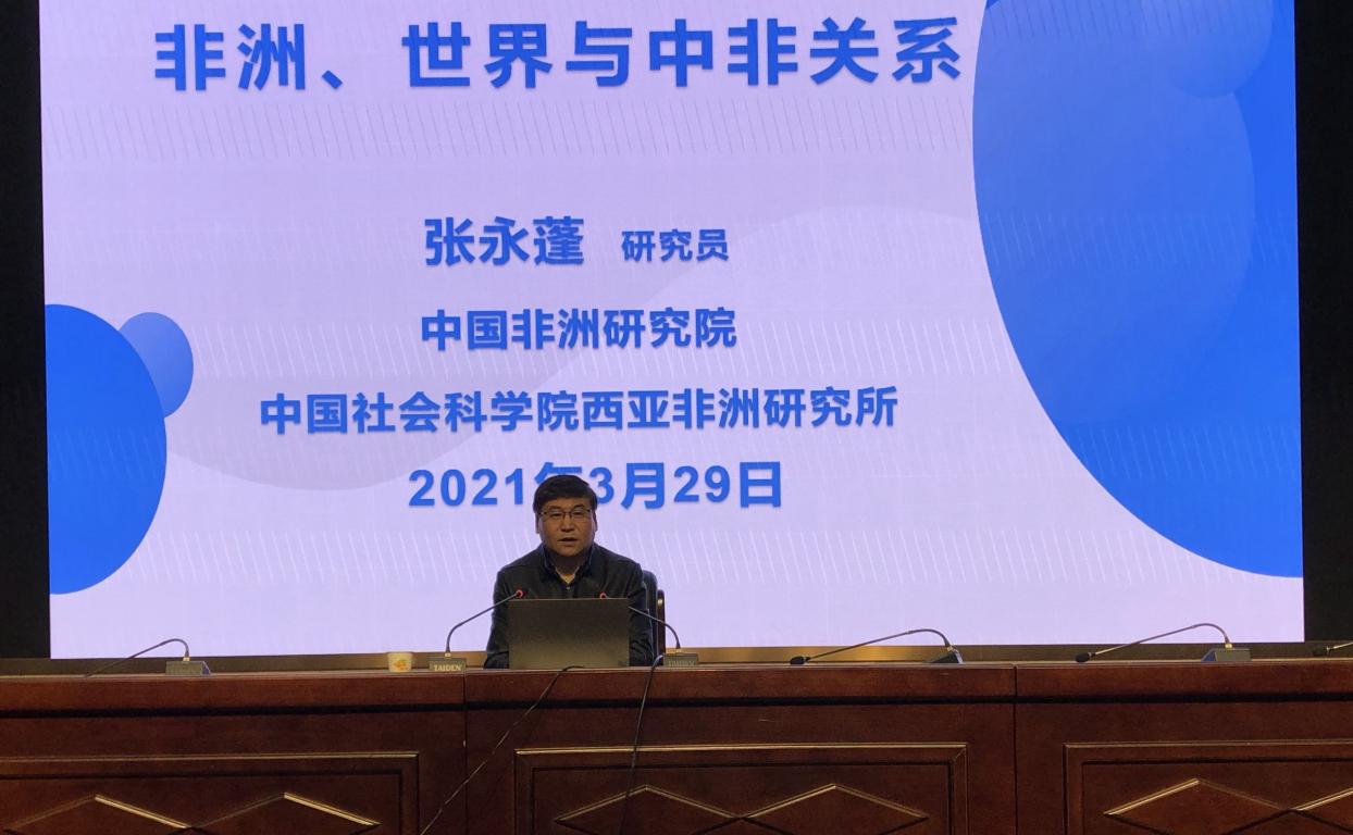为培养我校学生的国际视野,引导学生正确认识世界和中国发展大势,深入了解中非关系发展及前景,我校于2021年3月29日下午17:00在长安校区实验楼A区模拟联合国实验室开展“中非论坛系列学术讲座”第一场讲座。本次讲座邀请到中国非洲研究院、中国社会科学院西亚非洲研究所研究员,中国社会科学院大学张永蓬教授作题为“非洲、世界与中非关系”的学术报告。