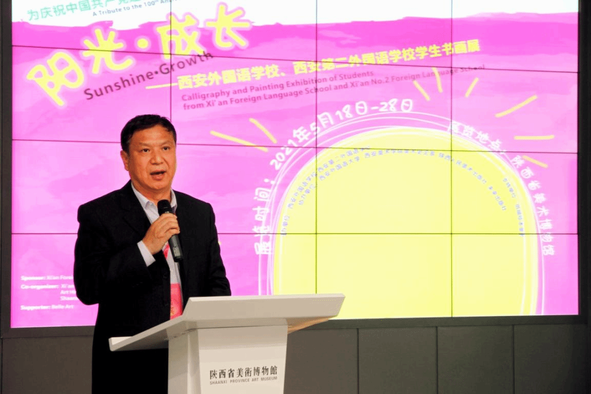 白黎在致辞中指出,今年是中国共产党100周年华诞,本次书画展以“阳光·成长”为主题,以书言志,以画寄情,饱含着师生们心系祖国、关心社会的爱国情怀,充分表达了师生们对党的深情厚意,对祖国的无限热爱,对生活的热情赞美和对未来的无限希望,是西安外国语学校和西安第二外国语学校新时代美育工作的生动展示,是对中国共产党百年华诞的一次献礼。他指出,美育是情操和心灵的教育,不仅能够提升人的审美素养,还能够潜移默化地影响人的情感、趣味、气质、胸襟,激励人的精神,温润人的心灵,对于立德树人具有独特而重要的作用。希望通过此次书画展搭建起学校和社会多方合力的美育交流展示平台,希望在省美术博物馆这座艺术的殿堂里,学生能够拥有感受美、鉴赏美、创造美的心灵,能够更加阳光、健康的成长,成就美好的人生。
