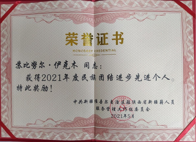 为深入贯彻落实新时代党中央治疆方略、第三次中央新疆工作座谈会精神,积极开展民族团结工作,促进各民族广泛交往,全面交流,深度交融,铸牢中华民族共同体意识。5月31日,新疆维吾尔自治区驻陕西省新疆工作组党委举行了2021年度民族团结进步先进集体、先进个人表彰大会。我校俄语学院2017级学生苏比努尔•伊克木荣获2021年度“民族团结进步先进个人”荣誉称号。