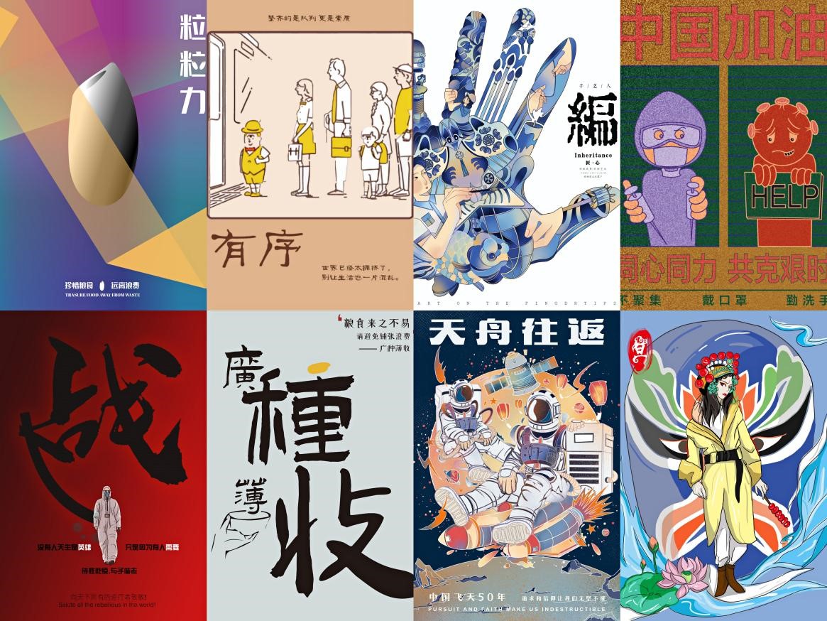 海报展分为“战疫力量”“我的航天梦”“珍惜盘中餐”“传统文化之美”等四个主题。作品均由艺术学院学生原创设计,充分反映了艺院学子坚守并践行着“爱国、为民、崇德、尚艺”的文艺价值观。海报展以文质兼美的优秀作品热情讴歌党、讴歌祖国、讴歌人民,唱响时代主旋律,传播社会正能量,进一步激发了学生的爱党爱国热情,引导当代大学生通过自身专业实践和艺术创作增强“四个自信”,献礼中国共产党建党100周年!
