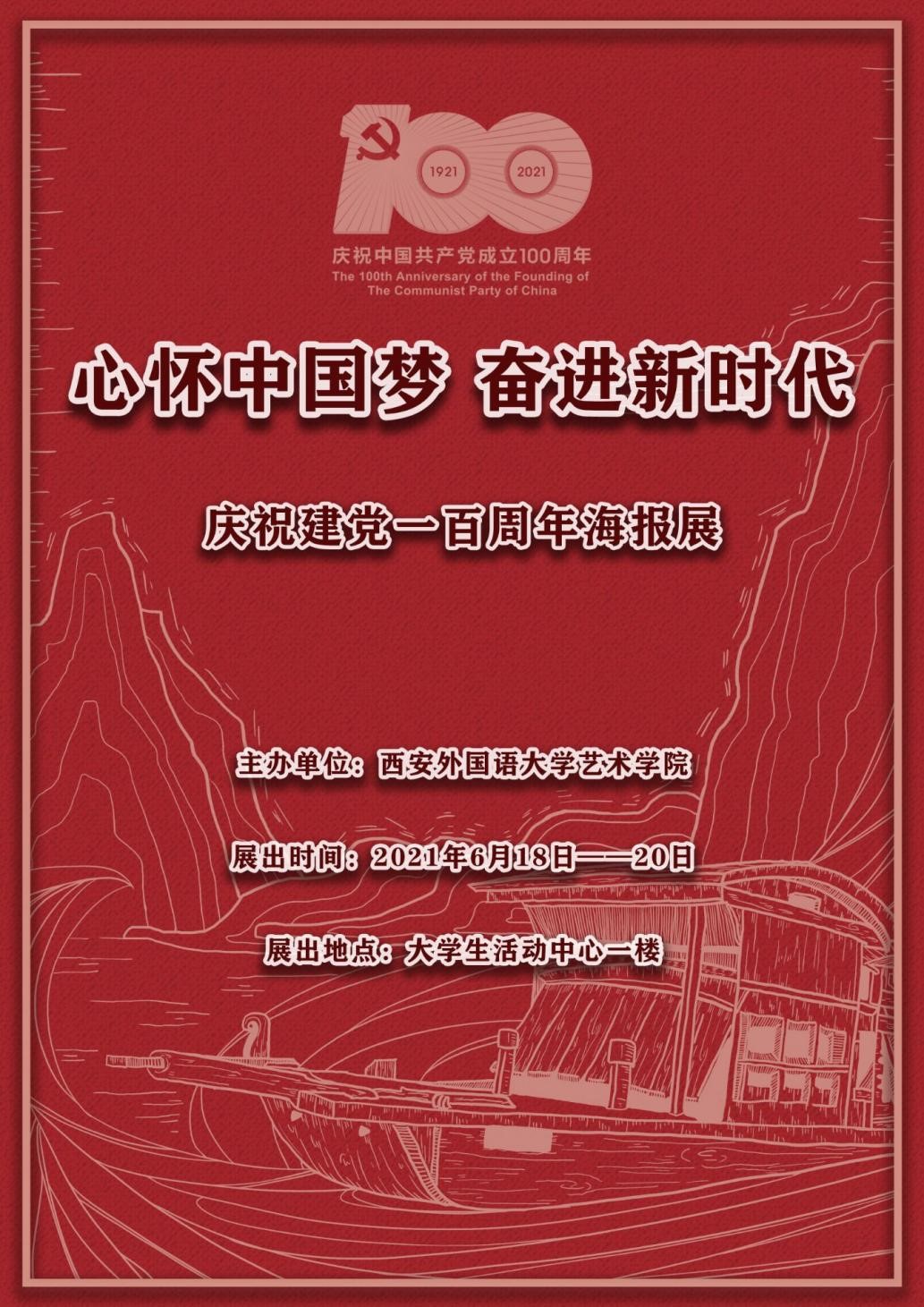 为热烈庆祝中国共产党建党100周年,6月18日-20日,艺术学院在长安校区大学生活动中心一层举办“心怀中国梦奋进新时代”庆祝中国共产党建党100周年主题海报展。