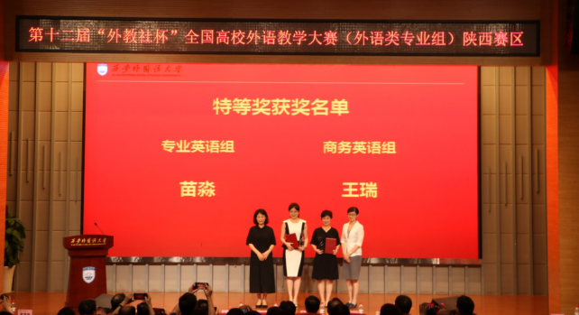 本次大赛本着“严谨、公平、公正”的原则,采取复赛和决赛两轮制以及“授课+说课+评委提问”的形式进行比赛,着重考察参赛教师对教学理念、授课环节以及教学设计的理解和创新。比赛过程中,参赛教师精神饱满,思路清晰,设计新颖,教态自然。经过紧张激烈的角逐,来自我校的苗淼老师和西安文理学院王瑞老师脱颖而出,分获本次比赛英语专业组和商务英语组特等奖,将代表陕西赛区参加全国总决赛。