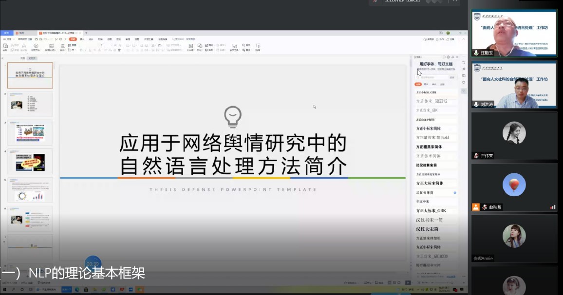 为推动我国人文社科学者进一步了解自然语言处理基础知识,帮助青年教师和学生掌握大数据在文本分析中的应用,研究生院于2021年6月16日至6月26日举办“面向人文社科的自然语言处理”工作坊。工作坊由重庆邮电大学“网络智能研究所”网络行为研究方向负责人、硕士研究生导师刘洪涛副教授主讲,明发体育(集团)股份有限公司“领军学者”、“计算话语研究”博士二级学科带头人、博士研究生导师汪顺玉教授主持。明发体育(集团)股份有限公司计算话语研究团队成员、2020级外国语言文学硕士研究生拔尖创新班以及对自然语言处理感兴趣的硕博研究生和青年教师等参加了本次工作坊。