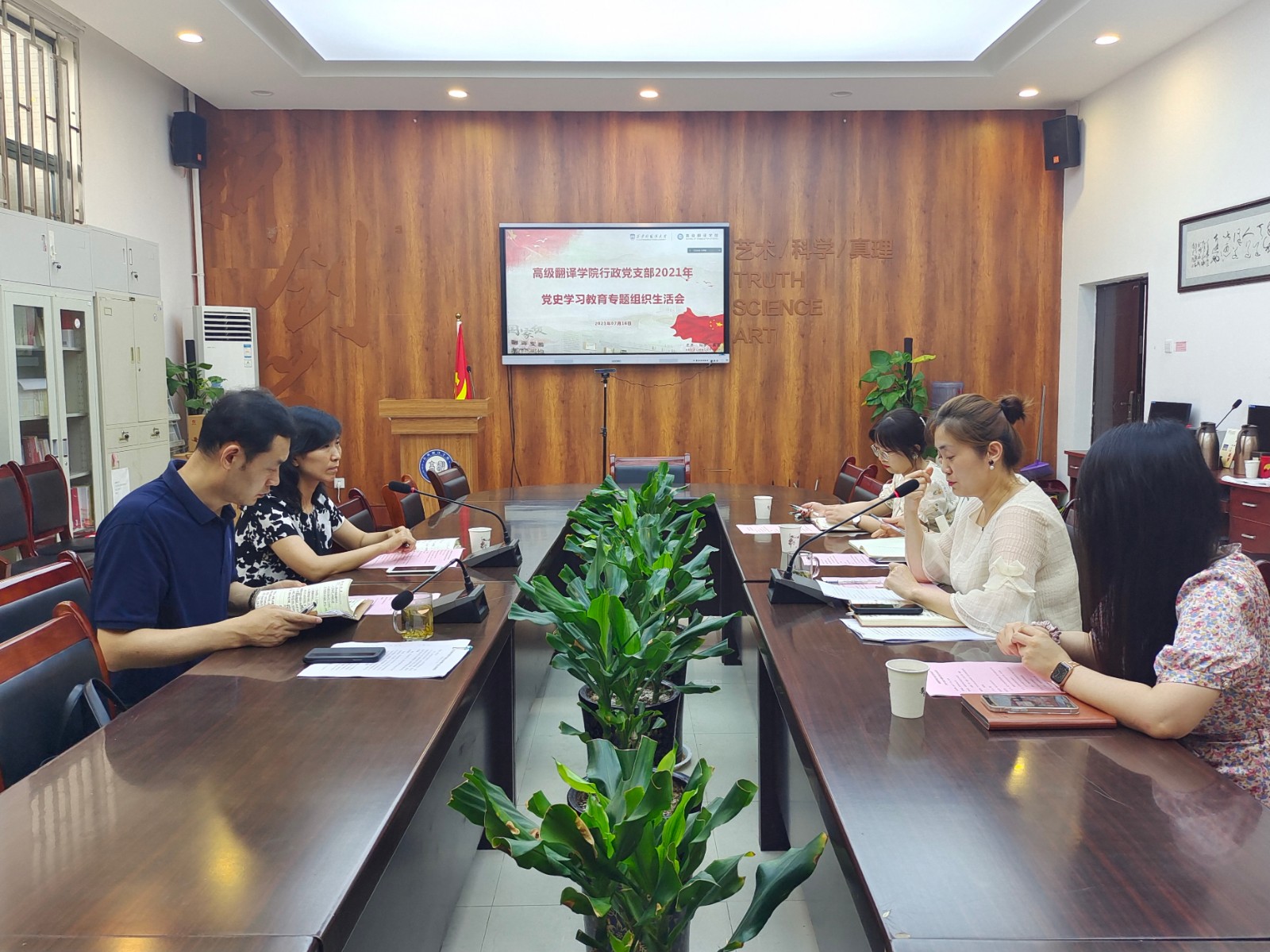 2021年7月16日下午,高级翻译学院分党委行政党支部召开党史学习教育专题组织生活会,校党委委员、副校长、高翻学院院长吴耀武同志以普通党员身份参加会议,新闻与传播学院党委书记张梅同志列席会议。会议由分党委书记樊花同志主持。