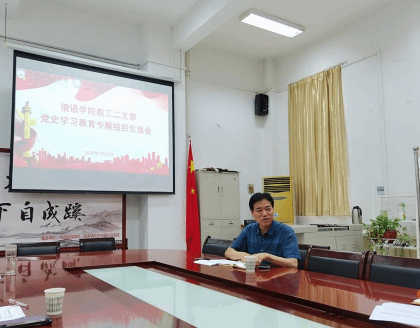 为深入学习贯彻习近平总书记在党史学习教育动员大会和庆祝中国共产党成立100周年大会上的重要讲话精神,扎实推进党史学习教育工作取得实效,7月14日下午,俄语学院教工第二党支部在JH106会议室组织召开党史学习教育专题组织生活会。副校长党争胜同志以普通党员身份参加组织生活会并与支部党员进行深入交流。会议由支部书记余源同志主持。