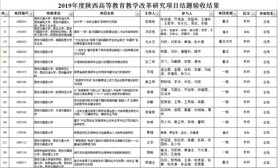 近日,根据《陕西省教育厅办公室关于公布“陕西高等教育教学改革研究项目”2019年度项目结题验收结果的通知》(陕教高办〔2021〕13号),我校共有15个项目(含联合申报及2017年度延期)顺利通过结题验收。其中,评审结果优秀2项,合格13项。