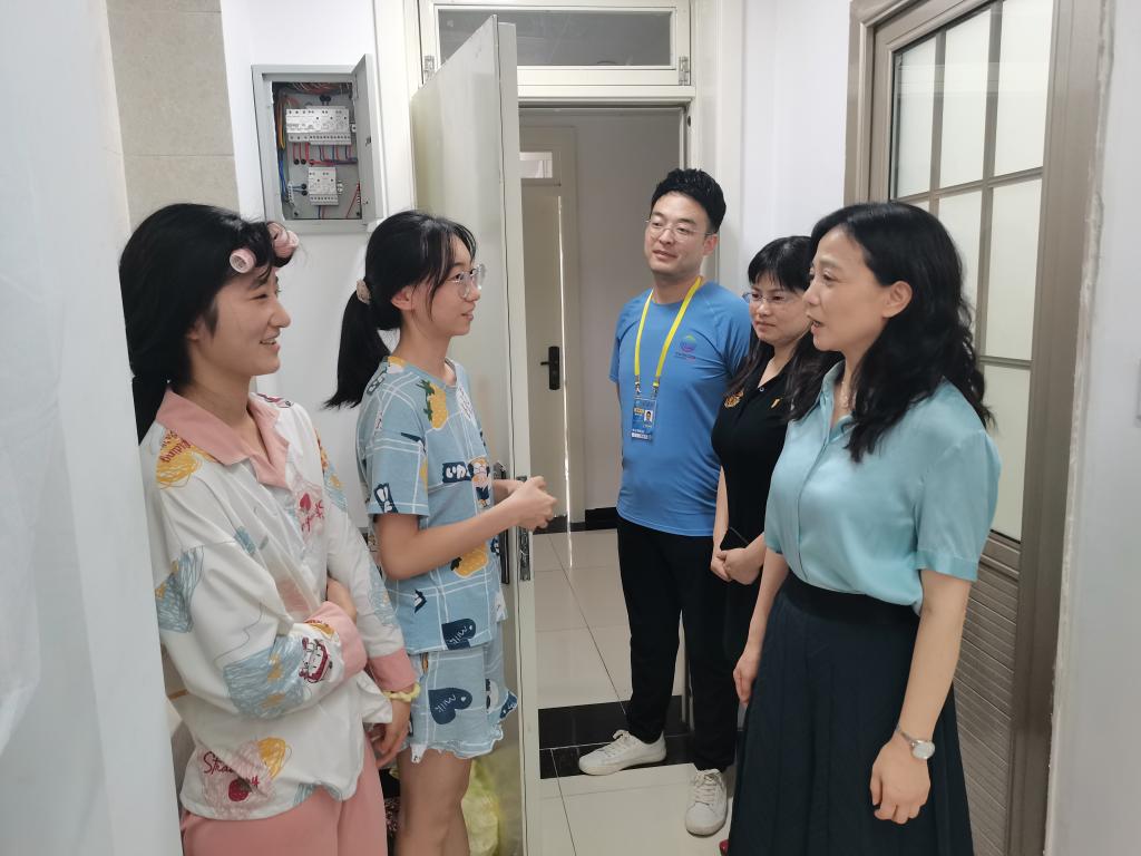 马洁一行首先来到我校学生演员宿舍,关心大家对新环境的适应情况,并深入寝室与学生进行了交流,详细询问学生们的日常排练和生活情况,了解存在的困难和进一步的需求,并给予亲切关怀与鼓励。在教师宿舍,马洁看望慰问了我校十四运会学生演员带队教师,对他们能在各自岗位上履职尽责、担当作为表示肯定与感谢。同时勉励各带队教师要继续发扬无私奉献、吃苦耐劳的精神,不负重托、不辱使命,为十四运会的圆满举办展现西外担当,贡献西外力量。