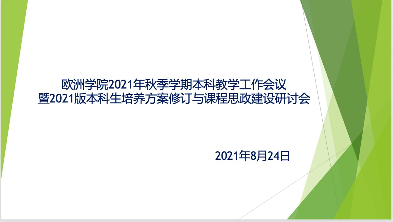 8月24日上午,欧洲学院在线召开了2021年秋季学期本科教学工作会议暨2021版本科生培养方案修订与课程思政建设研讨会。会议邀请上海外国语大学德语系博士生导师梁锡江教授,“教育部外指委委员”张世胜、黄楠,以及我校职能处室相关人员参会。欧洲学院领导班子成员,各专业带头人,各系、教研室主任及教学办公室相关人员参加研讨。
