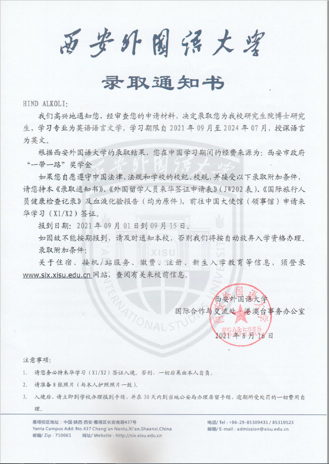 受新冠肺炎疫情影响,该生暂时不能入境,学校在9月份开学后拟通过网络授课的方式为该生进行在线授课。招收国际博士研究生是我校在“一带一路”倡议的背景下,结合高校“双一流”建设,强化外国语言文学学科优势所做出的开创性决策。海迪(HIND ALKOLI)作为我校建校以来招收的首位国际博士研究生,实现了我校国际博士研究生培养零的突破,标志着我校国际学生培养进入了“本、硕、博”三个层面的立体化培养新阶段。下一步,我校将继续秉承“立足陕西,服务西北,辐射全国,面向世界”的理念,加强学科建设、拓宽招生思路,不断完善国际学生各项培养、服务工作,为更好的传播中华文化、讲好中国故事贡献力量。