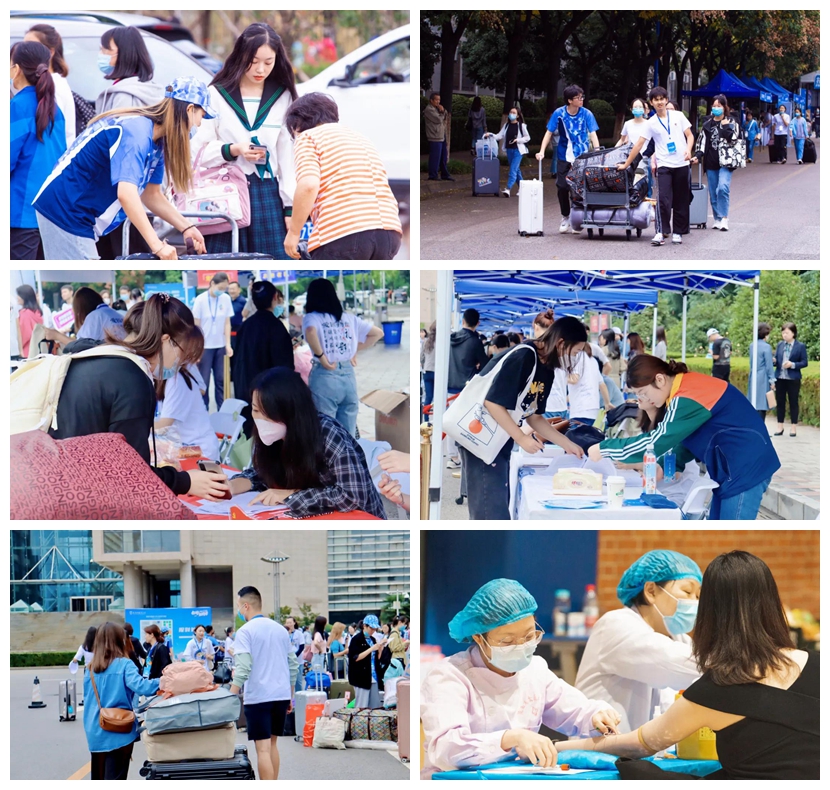宣传部通过电子屏、宣传栏、“两微一端”及现场采访报道等多种形式,积极营造浓厚的迎新氛围;保卫处工作人员全力疏导交通压力,引导车辆停放,保障新生报到期间道路交通安全;团委组织志愿者队伍,帮助新生搬运行李,参与校园引导、咨询服务工作中,忙碌穿梭的身影俨然成了校园的一道风景;财务处在学生事务大厅设置学费缴费办理窗口,提供一站式相关业务服务;学生处资助管理中心在现场开设“绿色通道”,向新生宣传资助政策,安排专人、专项办理家庭贫困学生的入学手续;后勤管理处采取一系列迎新措施,提前做好学生公寓水、电、管道维护,加强公寓和学生食堂等公共区域的保洁、消毒等工作,营造舒适的就餐和生活环境;教育产业发展中心全力做好校园服务保障工作,引入多家商户进驻校园,方便师生日常生活;校医院根据疫情防控需要,将新生健康体检点设置在文体馆,方便学生体检,流程管理有序,疫情防控严密;信息化处·信息技术中心在数字迎新上再次发力,从网上报到、返校申请提交到现场人证核验、扫码报到,从数据推送到现场机器人,都为迎新工作提供了强有力的信息化服务支撑和设备保障,实现了“一网通办”,高效迎新,便捷报到。