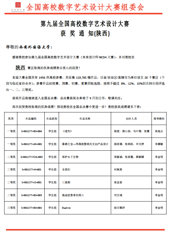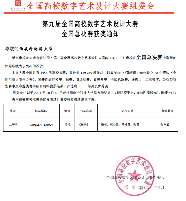 日前,第九届全国高校数字艺术设计大赛(NCDA Awards)总决赛奖项公布。我校艺术学院动画专业李金明、米娜敏、张宛云老师指导的动画专业学生作品,经过校赛、预赛、省级初赛、省级复赛、全国总决赛层层选拔,最终斩获总决赛本科组二等奖1项;在陕西赛区评选中,我校获得一等奖2项、二等奖4项、三等奖5项。