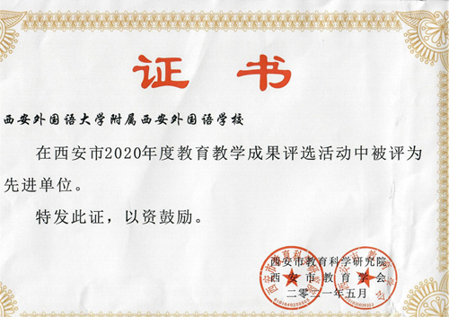 近日,在西安市教育科学研究院、西安市教育学会公布的2020年度西安市教育教学成果评选活动结果中,附属西安外国语学校再创佳绩,被评为西安市2020年度教育教学成果评选活动先进单位。此次评比活动中,附属西安外国语学校共计254项教育教学成果获奖,其中一等奖51名,二等奖73名,三等奖130名。