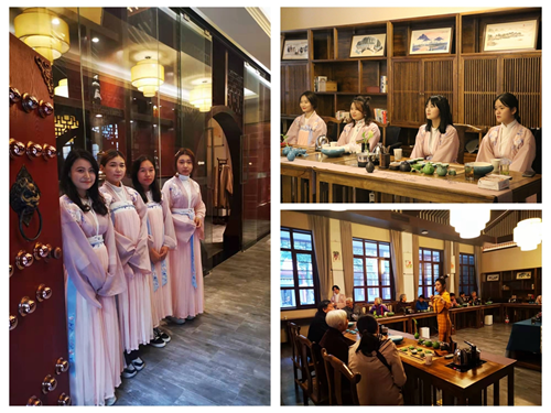在茶艺展示中,同学们与退休教职工一起跟随茶艺师共同体验传统茶艺文化。茶艺师向大家介绍茶的种类并一一解答了老教师们的疑惑,提出健康的饮茶方法。那生香熏袖,高山流水温盏盅,玉液移壶盛甘露。新火试新茶,仿佛梦回古时,见证烟雨行舟,青山碧水。