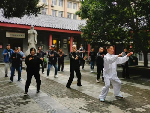 四合院内,老少共同体验太极文化。长者教得用心,晚辈学得认真,大家都热情、投入,动作整齐划一、标准到位,如行云流水一般,充分展现了太极拳的风格特点。师生欢聚一堂,在欢声笑语中共叙老少情,以其独特的方式为美丽校园增添无限的活力。