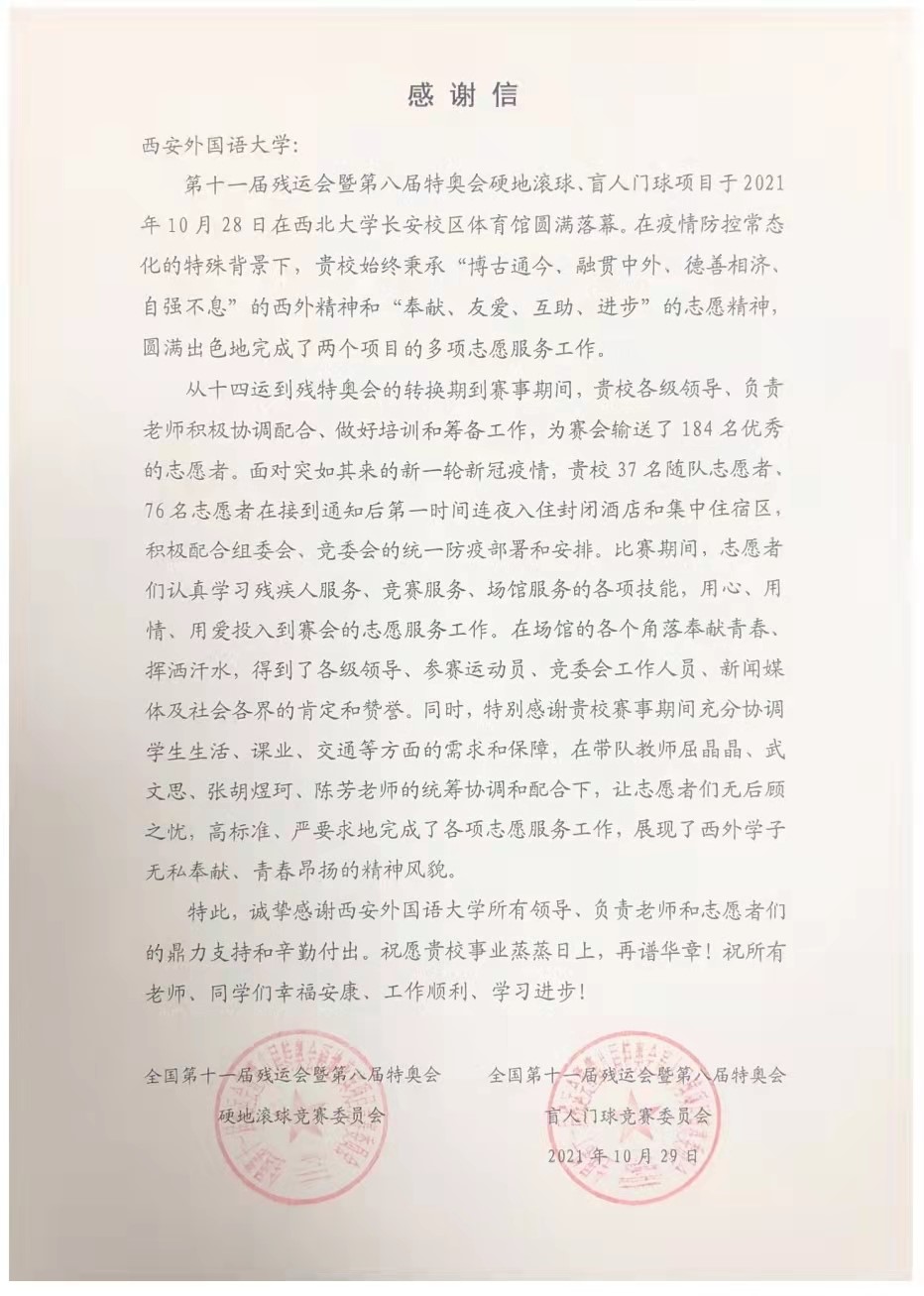 点亮梦想,为爱起航。在本次残特奥会志愿服务中,我校志愿者不仅展现了西外学子的优良风貌,更传递了爱心、传播了文明。“小秦宝”的奉献和爱心不仅收获了友谊和成长,也受到了中央电视台新闻频道《朝闻天下》、陕西广播电视台、西北大学官方视频号等媒体的宣传报道,我校“小秦宝”的热情服务收到了盲人门球竞委会和硬地滚球竞委会的感谢信表扬。志愿服务虽然结束,但小秦宝从运动员身上学习到的坚持不懈、永不言弃的精神将继续鼓励青年志愿者们积极担当作为,成为堪当大用的新时代青年。
