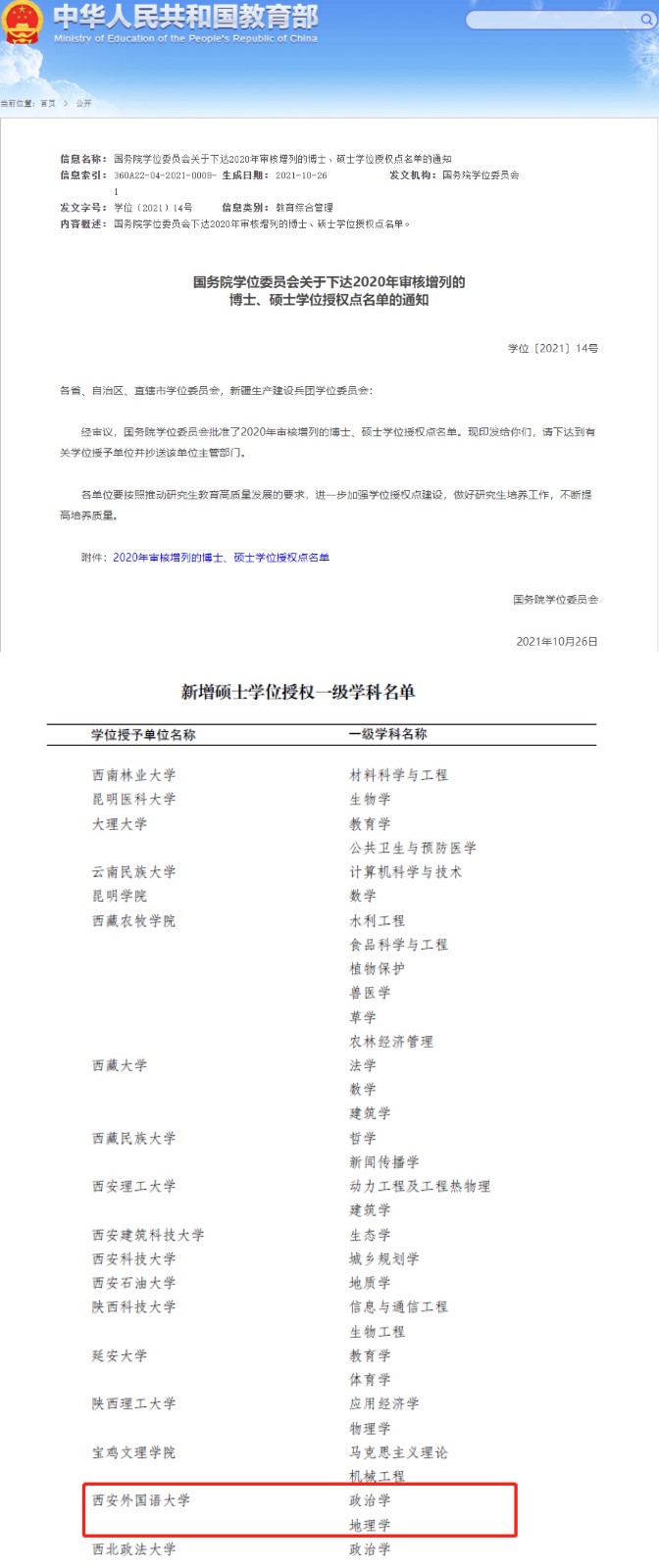近日,国务院学位委员会下发了《关于下达2020年审核增列的博士、硕士学位授权点名单的通知》(学位〔2021〕14号),正式公布了2020年学位授权审核结果。我校新增政治学、地理学2个硕士一级学科学位授权点。至此,我校共有1个博士一级学科学位授权点、9个硕士一级学科学位授权点、9个硕士专业学位授权点,基本形成了门类多样、层次清晰、体系较为合理的学位授权点新格局。