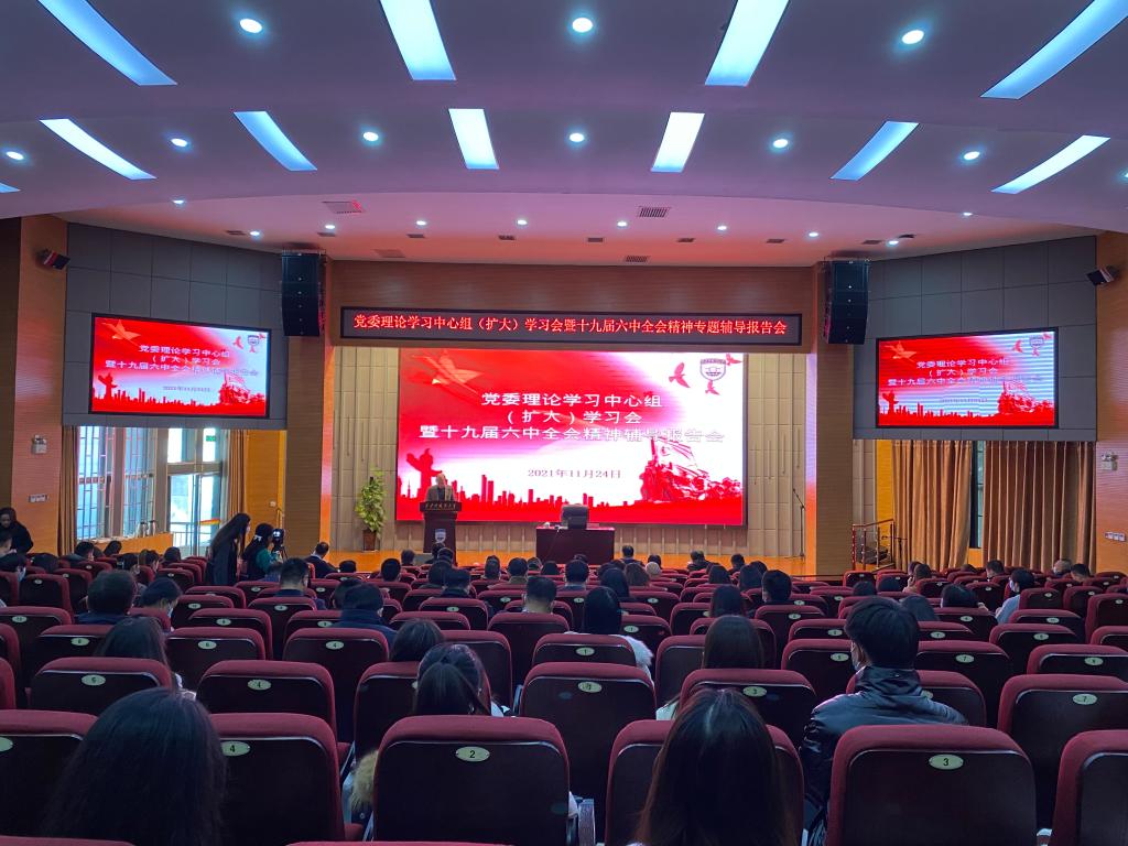 2021年11月24日下午,学校通过线上线下相结合的方式,在教学楼A区111报告厅举行党委理论学习中心组(扩大)学习会暨党的十九届六中全会精神专题辅导报告会。会议由党委副书记王强主持。