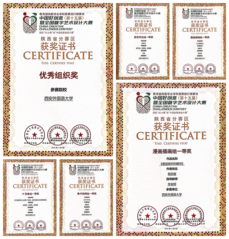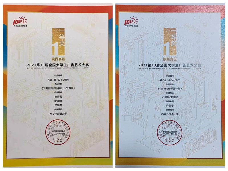 近日,艺术学院学子在教育部高等教育学会学科权威竞赛中再创佳绩,第十五届中国好创意暨全国数字艺术设计大赛陕西省分赛区,我校艺术学院获得优秀组织奖,一等奖5项,二等奖5项,三等奖10项,入选奖20项,优秀指导教师奖3项,共计44项。2021年第13届全国大学生广告艺术大赛,获国家级优秀奖1项,省级一等奖2项,二等奖3项,三等奖2项,优秀奖6项,共计14项。第七届两岸新锐设计竞赛·华灿奖,获国家级二等奖,西北赛区一等奖、三等奖。