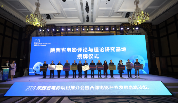 2021年陕西省电影项目推介会暨西部电影产业发展高峰论坛于12月1日在陕西省西咸新区秦汉新城召开,副校长党争胜带队参加本次活动。陕西省委宣传部常务副部长、省电影局局长王吉德、陕西省作家协会党组书记齐雅丽共同为“陕西省电影评论与理论研究基地”授牌,党争胜作为我校中国电影跨文化译介与传播研究基地首席专家上台参与授牌。