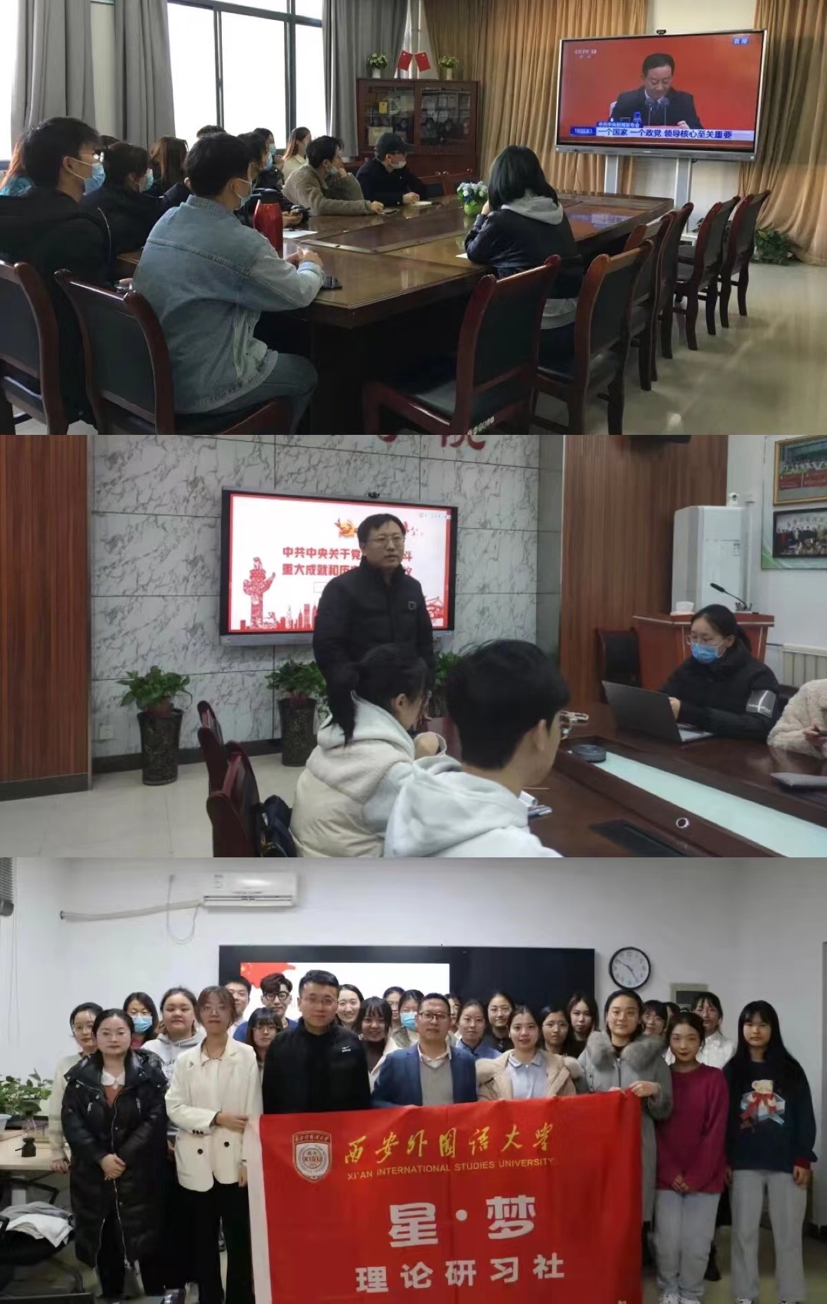精神学习有深度。为营造良好的全会精神学习氛围,校思想政治教育研究会为全校政治理论社团采购了包括《〈中共中央关于党的百年奋斗重大成就和历史经验的决议〉辅导读本》《党的十九届六中全会〈决议〉学习辅导百问》在内的500余册图书资料。校青年学习会利用“马列书屋”、马克思主义学院集体备课室开展多场专题学习分享活动。俄语学院白桦林理论研习社、英语师范学院“今日青年”思政理论研习社团、欧洲学院薪火理论研习社、高级翻译学院博译青马研习社、经济金融学院中国梦·青春志理论研习社也于近日开展专题学习活动,各社团通过社长领学、“全会金句”重点阐释和指导老师专题辅导培训等方式,对党的十九届六中全会精神开展深入学习。