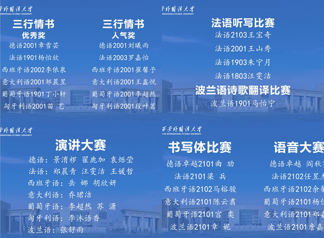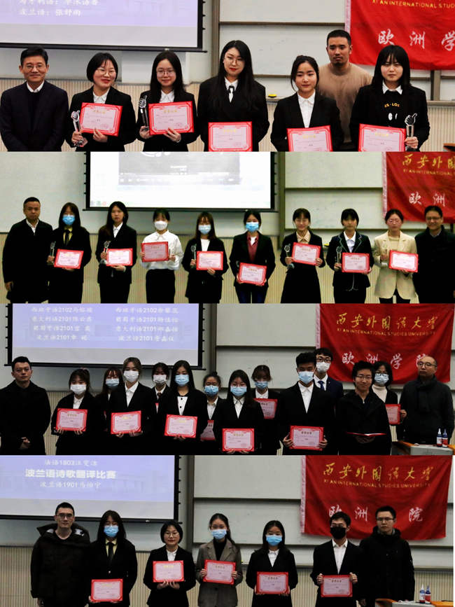 欧洲学院副院长朱强宣读学风建设月获奖名单,出席活动的领导分别为演讲大赛、书写体大赛、语音大赛、法语听写大赛、波兰语诗歌翻译大赛及三行情书等六项活动比赛中取得优异成绩的同学颁奖。