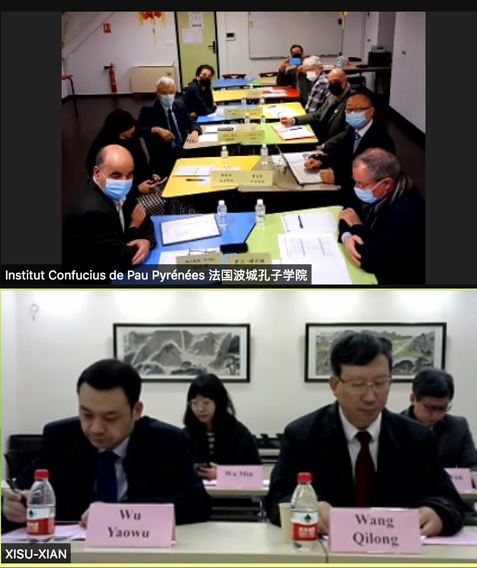 2021年12月10日下午,我校法国波城孔子学院理事会第一届第一次会议在雁塔校区中华文化体验中心通过线上形式与法方一同召开。副校长(主持行政工作)王启龙、副校长吴耀武出席会议。波城·贝阿恩·比利牛斯联合区政府副主席、波城市副市长、波城大学校长以及当地教育机构等代表共同参会。会议由波城·贝阿恩·比利牛斯联合区政府副主席默罕默德·阿马拉(Mohamed Amara)及我校国际合作与交流处处长景楠共同主持。