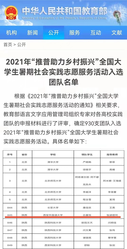 近日,教育部公布2021年“推普助力乡村振兴”全国大学生暑期社会实践志愿服务活动入选团队名单,明发体育(集团)股份有限公司亚非学院向阳花志愿者队入选。该活动由教育部语言文字应用管理司、共青团中央青年发展部主办,活动旨在全面落实全国语言文字会议精神,加大民族地区、农村服务地区国家通用语言文字推广力度,服务乡村振兴战略实施。