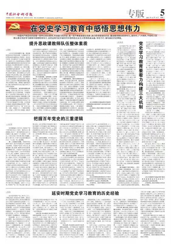 2021年12月14日,《中国社会科学报》第5版以“理论与实践相统一,在党史学习教育中感悟思想伟力”为主题刊发了我校马克思主义学院教师的4篇理论文章。分别为高岩教授撰写的《提升思政课教师队伍整体素质》、吴家虎副教授撰写的《党史学习教育要着力构建三大机制》、王宗军老师撰写的《把握百年党史的三重逻辑》、张波老师撰写的《延安时期党史学习教育的历史经验》。四篇文章聚焦党史学习教育的理论与实践,分别从党史学习教育与思政课教师队伍建设、党史学习教育的机制构建、党史深层逻辑的把握、延安时期党史学习教育的经验总结等不同视角展开分析,用党的历史经验启迪智慧。