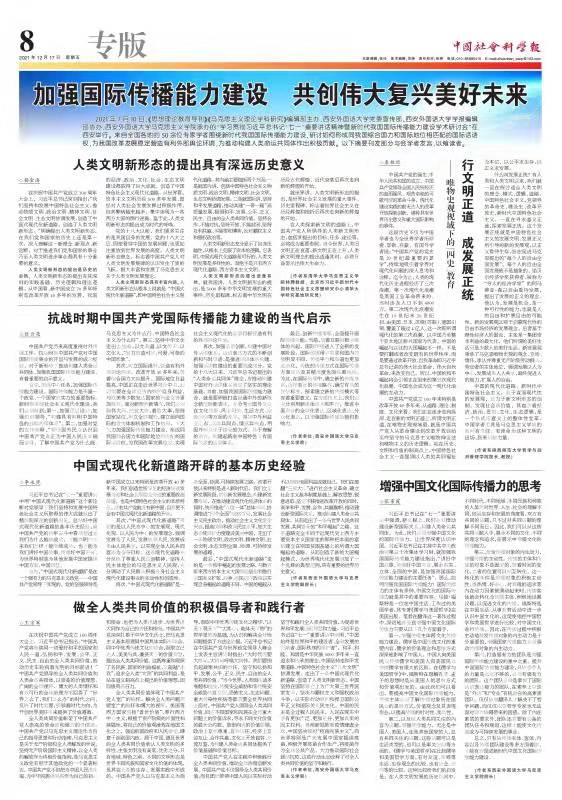 2021年12月17日,《中国社会科学报》第8版以“加强国际传播能力建设 共创伟大复兴美好未来”为主题刊发了我校马克思主义学院教师的4篇理论文章。分别为张亲霞教授撰写的《增强中国文化国际传播力的思考》、李永虎教授撰写的《中国式现代化新道路开辟的基本历史经验》、王宗军老师撰写的《做全人类共同价值的积极倡导者和践行者》、伍云亮博士撰写的《抗战时期中国共产党国际传播能力建设的当代启示》。同版刊发的还有清华大学马克思主义学院杨金海教授、陕西师范大学哲学与政府管理学院袁祖社教授的两篇文章。上述文章分别从“人类文明新形态”、“中国式现代化新道路”、“全人类共同价值”等不同视角展开分析,深入阐释了如何学习贯彻习近平总书记“七一”重要讲话精神、努力提升新时代我国的国际传播能力建设。