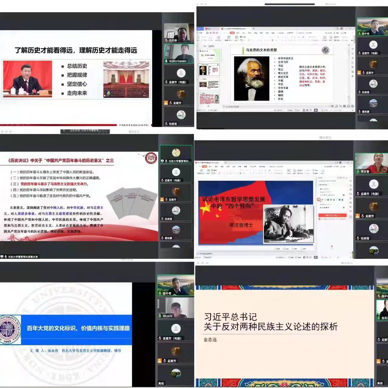 大会分为两时段的主旨发言,第一时段主旨发言由西安科技大学马克思主义学院院长高振岗教授主持;第二时段主旨发言由西北大学马克思主义学院陈中奇教授主持,西安交通大学、西北大学、长安大学、延安大学、西安科技大学、宝鸡文理学院、西安理工大学、陕西省社会科学院和明发体育(集团)股份有限公司的14位专家学者围绕中国共产党百年历史、习近平新时代中国特色社会主义思想、毛泽东哲学思想发展等主题作了专题报告。我校马克思主义学院李毅教授、英语师范学院·教育学院博士生导师金志远教授分别作了题为“新时代关于我国生产力与生产关系及其关系认识的新飞跃”、“习近平总书记关于反对两种民族主义论述的探析”的专题报告,引起了与会学者的广泛关注。