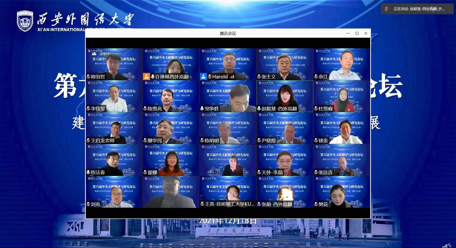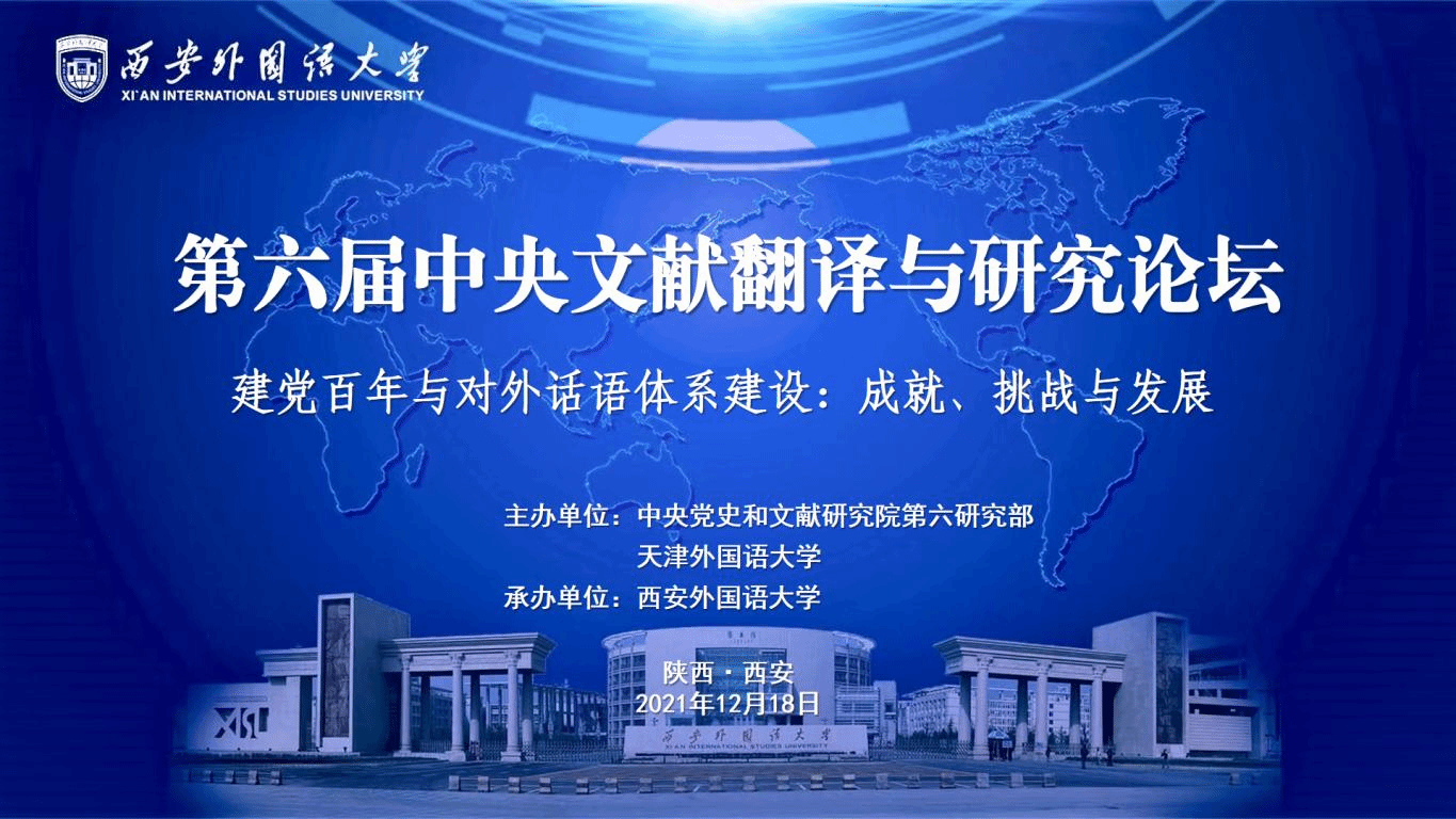 12月18日,由中央党史和文献研究院第六研究部、天津外国语大学联合主办,我校承办的第六届中央文献翻译与研究论坛在线上顺利举行。中宣部领导及中央党史和文献研究院第六研究部主任张士义、副主任卿学民及李铁军,天津外国语大学校长陈法春、副校长余江,中国外文局原副局长兼总编辑、全国翻译专业学位研究生教育指导委员会主任委员黄友义,中国前驻新西兰、瑞典前大使、外交部外语专家陈明明,我校副校长(主持行政工作)王启龙,副校长党争胜、吴耀武等出席会议。来自全国各地30余所高校机构的数百名专家学者及硕博研究生参会,近两万人通过直播平台云端听会。论坛开幕式由党争胜主持。