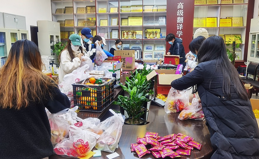 当晚,高级翻译学院还开展了走访学生宿舍慰问活动。校党委委员、统战部部长郑锐华、院党委书记樊花、副院长陈卫国、吉文凯以及教师党员王小燕、辅导员伊力哈木·图尔贡等对学院200余间宿舍,700余名学生进行了走访慰问,向每一位学生送上了充满爱意的新年大礼包。老师们悉心询问同学们管控管理期间的困难和诉求,全面传达学校疫情防控管理机制和举措,耐心解答同学们的疑问和困惑,并亲切叮嘱同学们在宿舍隔离期间不仅要精进学业,同时要加强锻炼、做好个人防护等,共同为学校疫情防控工作做出积极贡献。