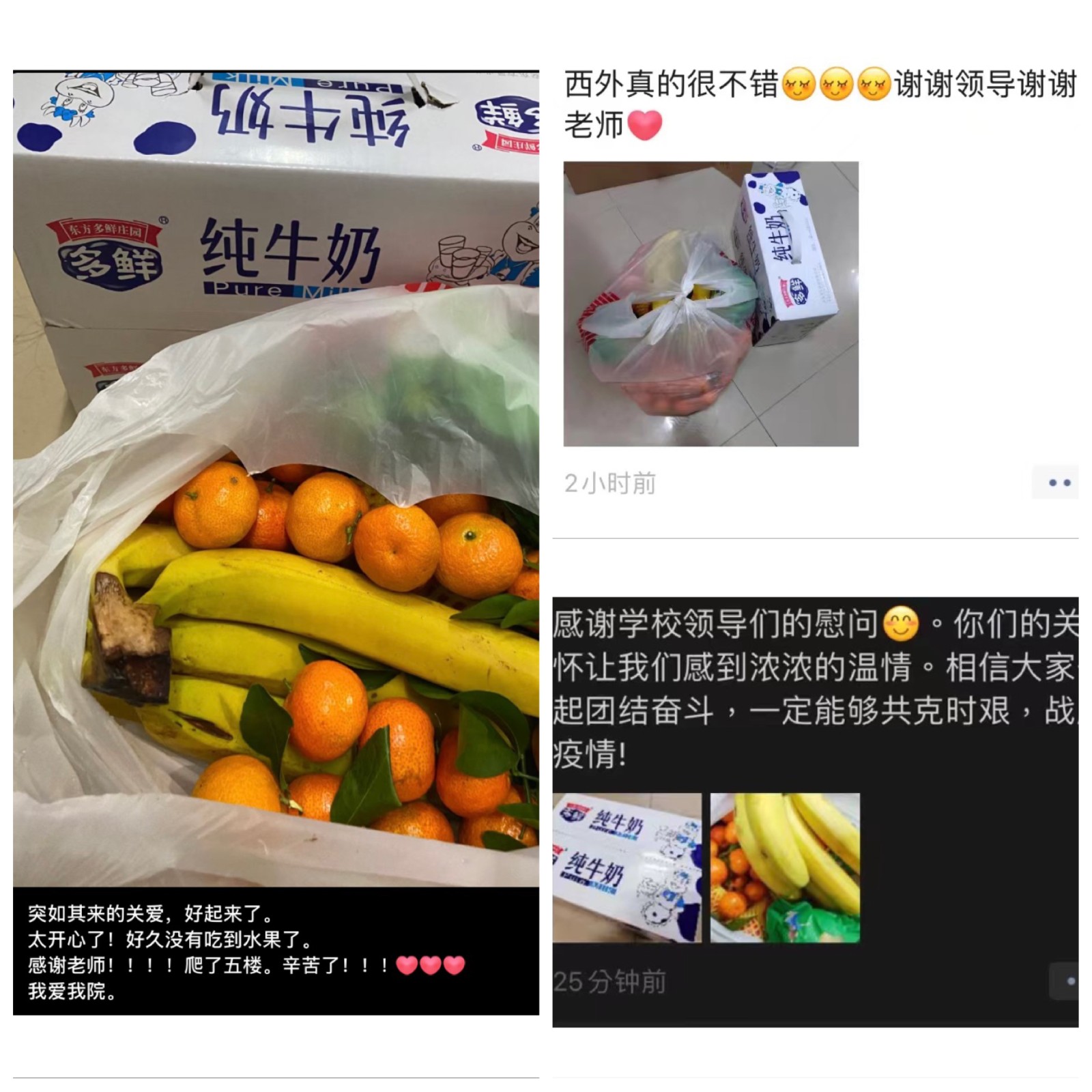 隔离同学纷纷表示,学校和学院老师的亲切慰问和深切关怀,让他们感受到了家的温暖,虽然被隔离,但隔离不隔爱,他们总是被照顾得很好。同时,同学们也表示一定积极配合学校疫情防控工作,服从学校安排,做好居家隔离,大家携手共克时艰。