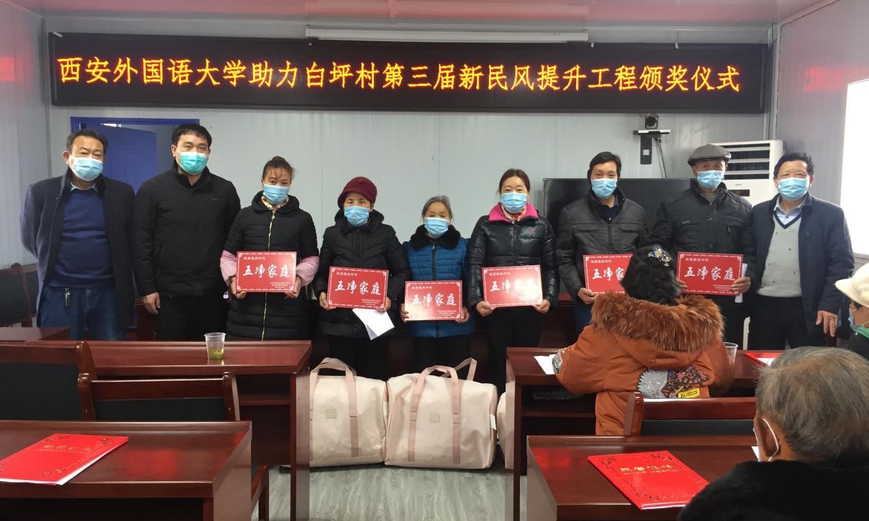 1月14日上午,我校助力白坪村第三届新民风提升工程于白坪村三楼会议室顺利开展。活动共评选出白坪村“五净”家庭9个,“诚孝俭勤和”标兵、“好媳妇、好婆婆”等称号获得者17人。