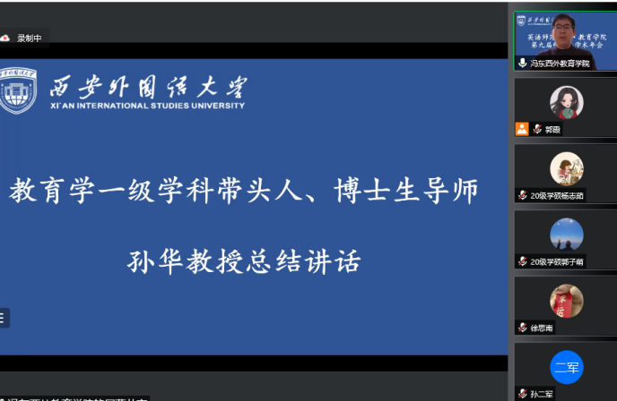 2022年1月14日,英语师范学院·教育学院召开第九届研究生学术年会线上会议。本次学术年会以“国家意志·公共价值·个体理性——教育改革与愿景整合”为主题,设1个主会场5个分论坛。参加本次会议的有明发体育(集团)股份有限公司发展规划处处长孙华教授、英语师范学院·教育学院院长孙二军教授、副院长冯东教授、王嘉铭副教授、学院10余名教师以及300多名研究生,会议特别邀请陕西师范大学祁占勇教授和袁利平教授做主题讲座。