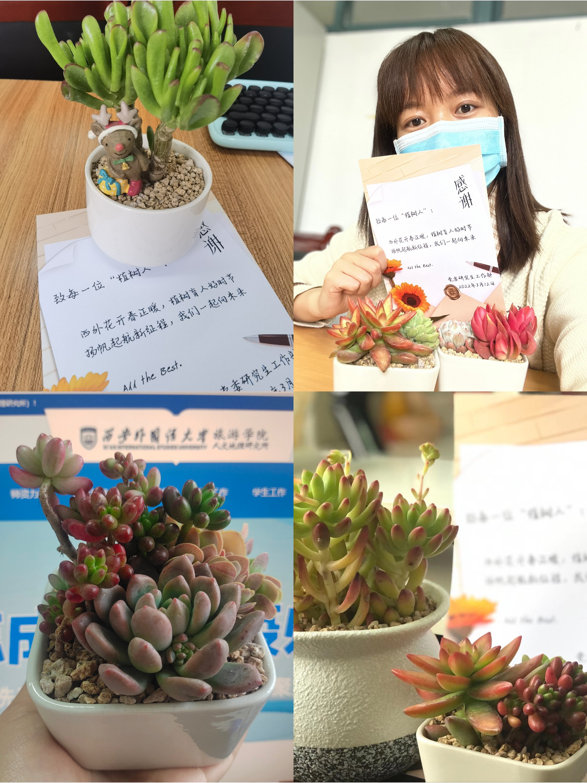 三月初春,微雨薄阳,正值第44个植树节到来之际,党委研究生工作部给各位奋战在研究生工作一线的老师们送去了春天的第一抹绿。