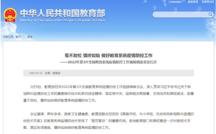 3月9日,教育部召开2022年第3次全国教育系统疫情防控工作视频调度会议,深入贯彻习近平总书记关于新冠肺炎疫情防控工作的重要指示批示和系列讲话精神,落实党中央、国务院决策部署,交流地方和高校做法,部署毫不放松、慎终如始做好教育系统疫情防控工作。