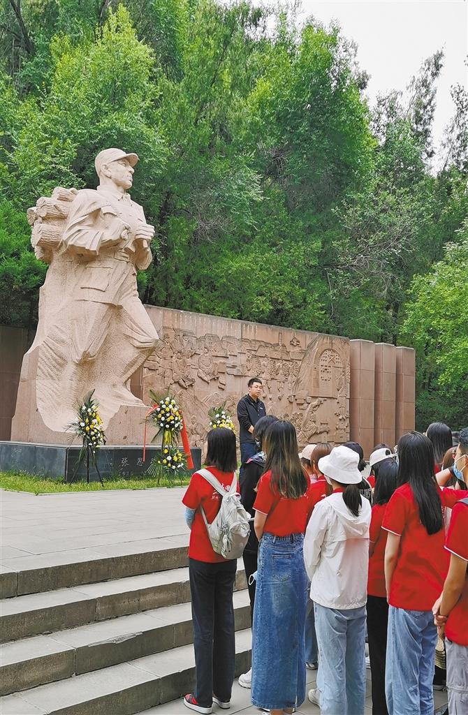 陕西师范大学思政课教师在张思德塑像前向学生们讲授革命先辈的英雄故事。