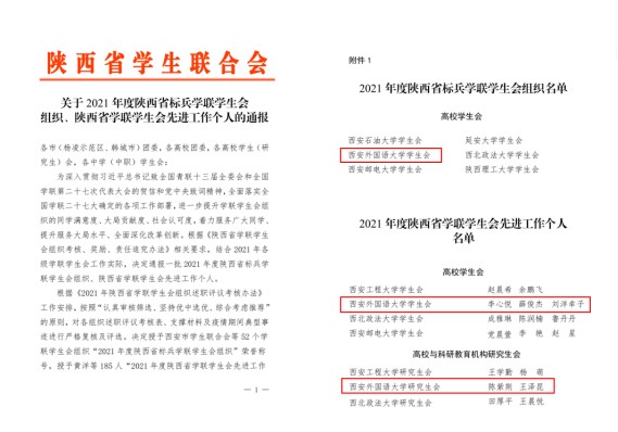 近日,陕西省学生联合会第十届委员会第五次全体会议在线上召开。团省委副书记鲁镇,团省委学校部部长、省学联秘书长郝鹏涛出席会议,陕西省各市(含杨凌示范区、韩城市)团委负责学校工作的同志、各市学联代表参加了会议。会上通报了2021年度陕西省标兵学联学生会组织、陕西省学联学生会先进工作个人,我校学生会荣获“2021年度陕西省标兵学联学生会组织”,校学生会主席团成员薛俊杰、李心悦、刘洋幸子,研究生会主席团成员陈紫荆、王泽昆荣获“陕西省学联学生会先进工作个人”。