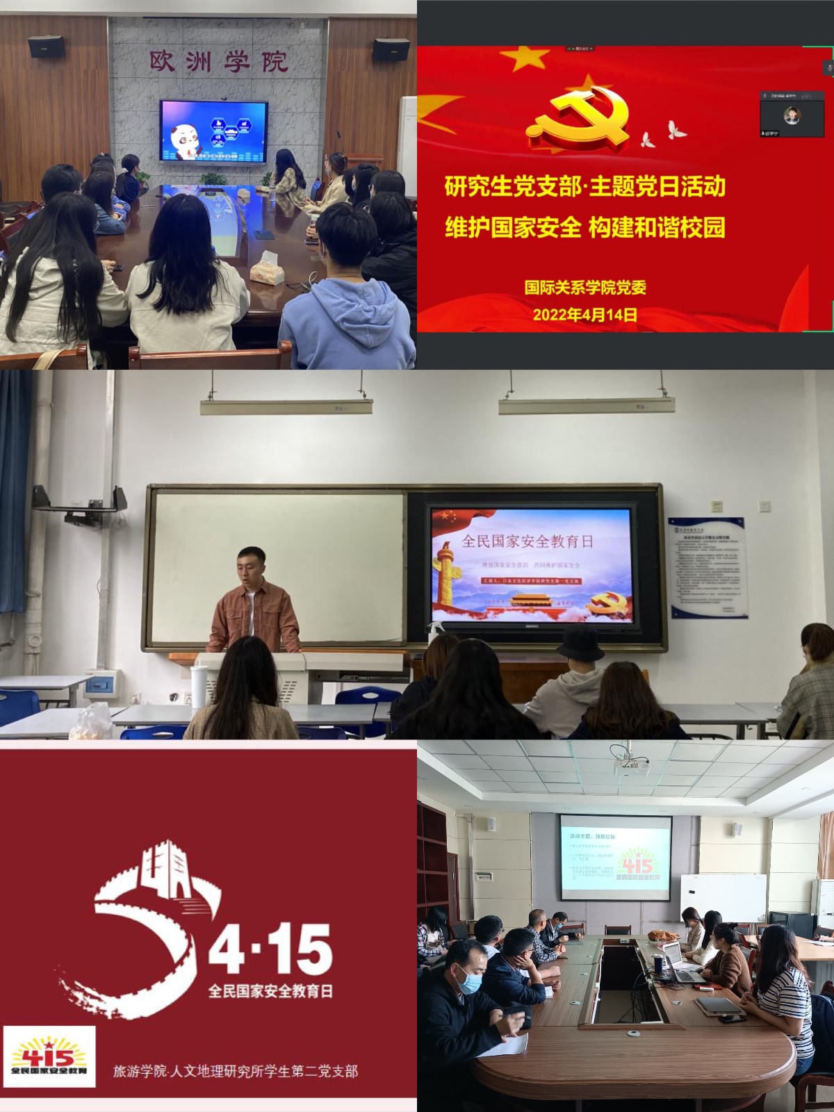 高级翻译学院研究生第三学生党支部通过播放微动漫《国家安全,人人有责》,普及《国家安全法》《反恐怖主义法》《保密法》等法律知识。旅游学院·人文地理研究所学生第二党支部组织党员观看“4·15”全民国家安全教育日公益宣传片。欧洲学院研究生党支部组织研究生党员观看了全民国家安全教育日特别节目《生命线》。