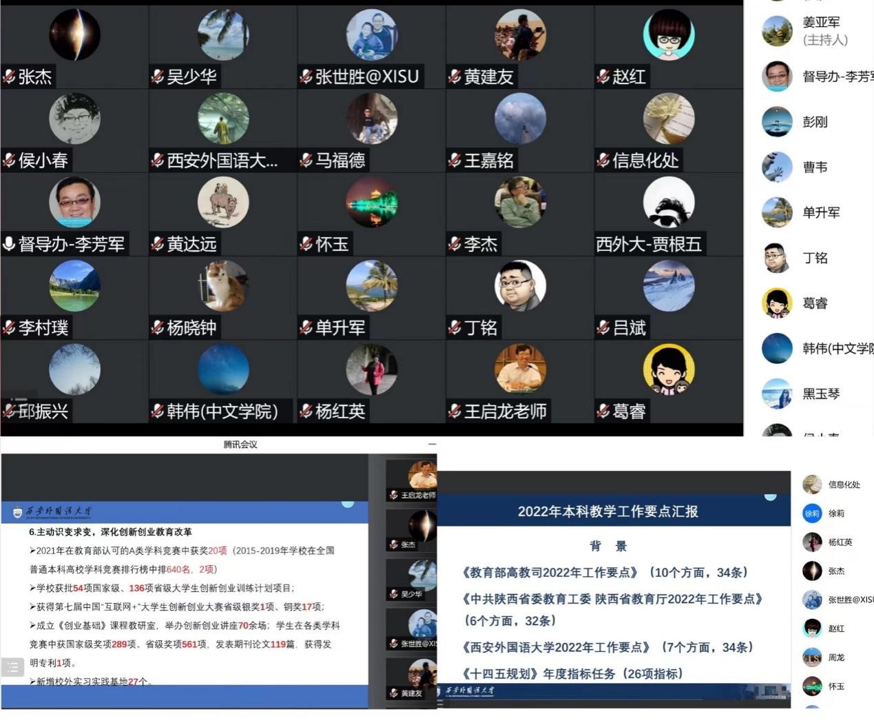 教务处处长庞闻通报了学校关于成立第二届本科教学工作委员会的决定,总结了2021年学校本科教学工作,对2022年本科教学工作要点作了汇报,并对近期本科教学工作进行安排部署。副处长葛睿就校级双创学院、“三进”教改专项、专业带头人遴选等工作进行了汇报。