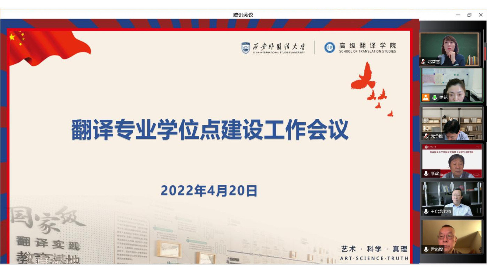 2022年4月20日,我校线上召开翻译专业学位点建设工作会议暨专家研讨会。副校长(主持行政工作)王启龙、副校长党争胜出席会议,校内翻译专业领域专家教授、相关学院负责人、教师代表参加会议。会议由高级翻译学院党委书记樊花主持。