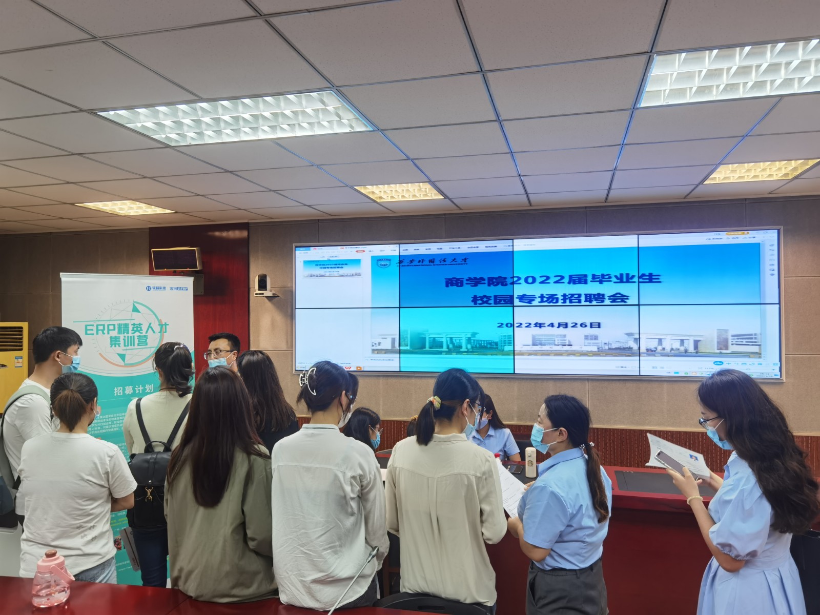 为进一步推进2022届毕业生就业工作,拓宽就业渠道,落实学校访企拓岗相关要求,2022年4月26日下午,商学院在SB302举办访企拓岗促就业行动暨2022届毕业生校园专场招聘会活动。校党委委员、党委副书记、纪委书记、监察专员王强,商学院院长周龙、党委书记邓雯、副院长王鹏、党委副书记兼副院长张晶,2022届毕业班辅导员马佳音、王岳、张雷参加此次活动。此次招聘会共邀请5家企业进校,提供岗位100余个,我院100余名毕业生参与其中。
