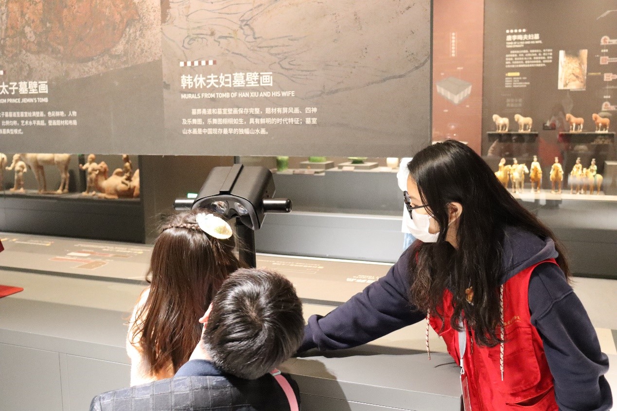 在志愿服务过程中,馆外志愿者配合工作人员对游客进行扫码测温,引导游客换票、进馆,帮助老人、儿童、残疾人等特殊游客预约购票,解答游客疑问;展厅志愿者积极倡导游客文明参观,有序购买文创产品,劝阻游客吸烟、用手触摸文物等不文明参观行为,充分展现出新一代青年志愿者的风采。