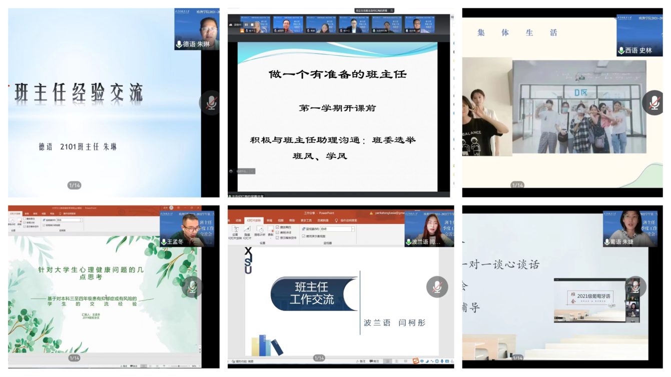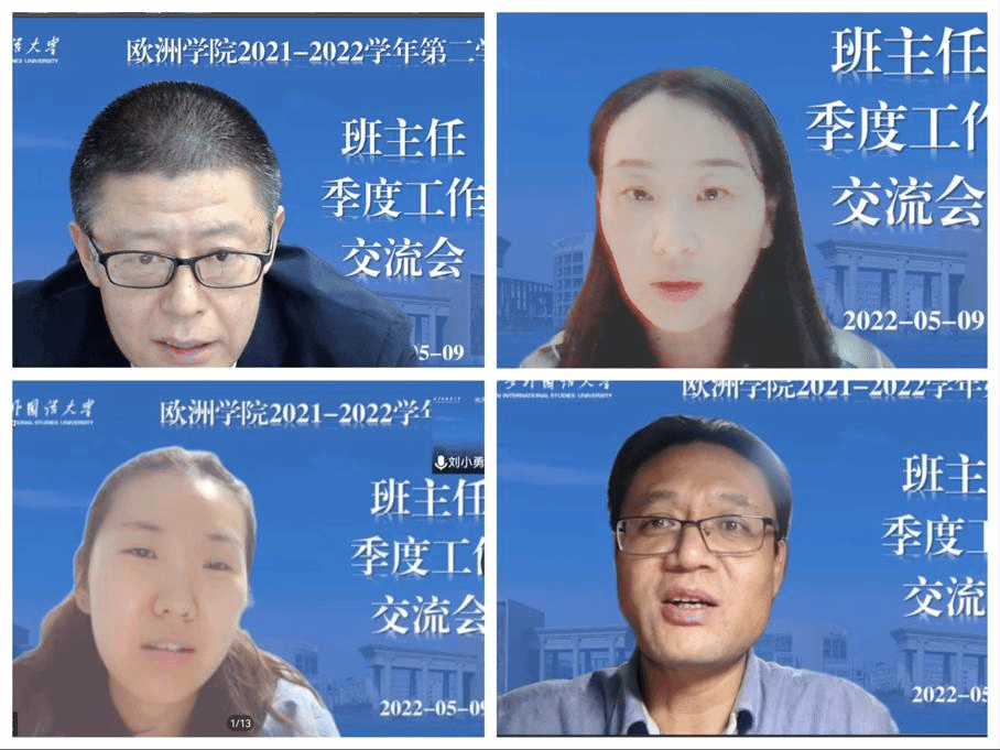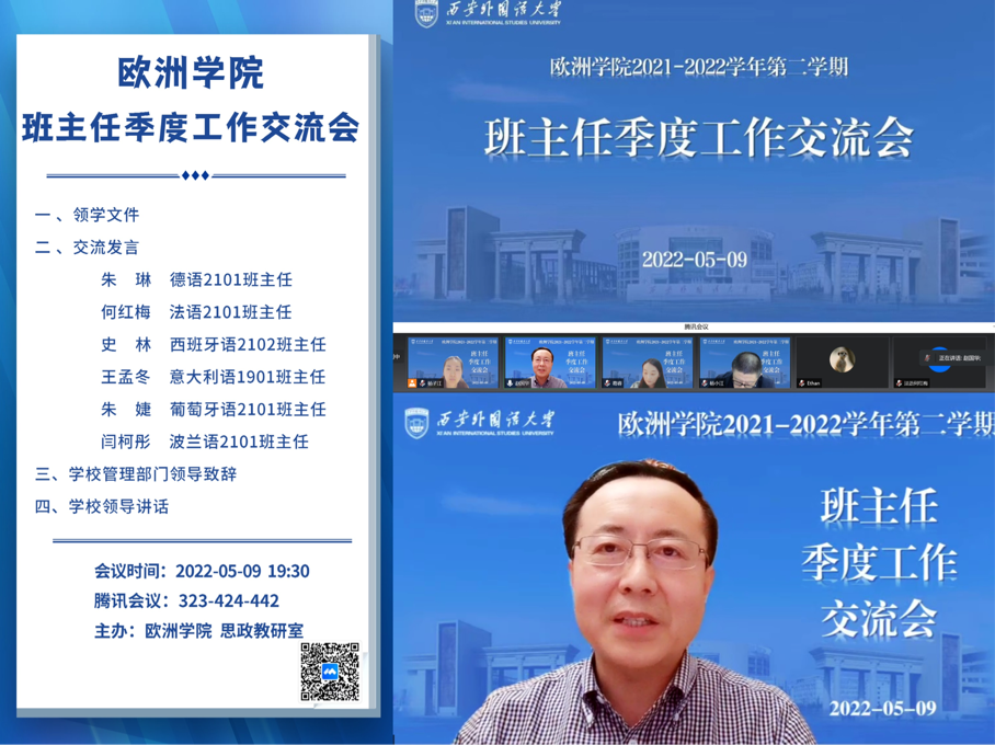 为持续加强和改进学院学生思想政治教育工作,促进班主任工作水平和能力提升,5月9日晚,欧洲学院举行2021-2022学年春季学期班主任季度工作交流会(线上)。副校长赵国华应邀出席并讲话,学生处副处长杨小江、教务处副处长葛睿应邀出席并致辞,欧洲学院全体领导班子,全体班主任以及辅导员参加会议,会议由学院思政教研室主任杨子江主持。