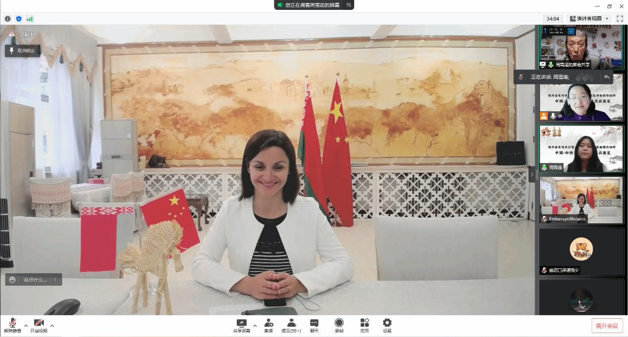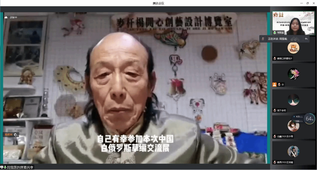 我校俄语学院党委书记魏民安宣布中国-白俄罗斯草编交流云展览活动正式开幕。白俄罗斯草编艺术大师斯杰普尔科教授以视频形式为全体人员带来一场生动有趣的草编“大师课”,她介绍了自己与“草编艺术”结缘的趣事,并通过镜头带领大家参观了自己的草编工作室,让同学们透过镜头欣赏到丰富多彩的白俄罗斯草编艺术作品,并详细示范了草编作品“小山羊”的制作过程。