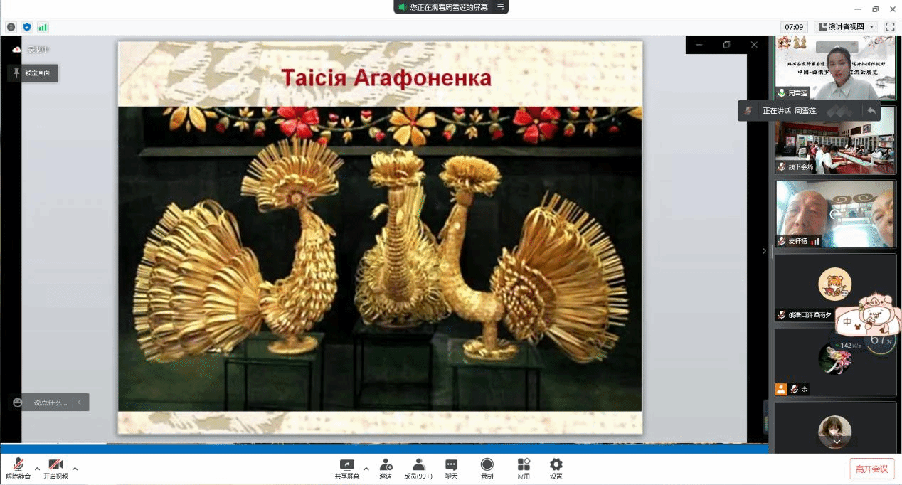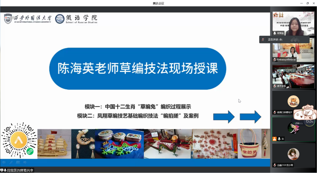 2022年5月10日下午,“踔厉奋发传承非遗文化,志存高远开拓国际视野”中国-白俄罗斯草编交流云展览开幕式以线上线下相结合的方式在我校隆重举行。白俄罗斯驻华使馆文化旅游体育新闻合作处负责人谢马什科﹒阿纳斯塔西娅﹒奥列格夫娜(Семашко А.О.)女士、白俄罗斯草编艺术大师、白俄罗斯国立美术学院斯杰普尔科﹒塔季杨娜﹒阿列克谢夫娜(Степурко Т.А.)教授、陕西省宝鸡市凤翔区非物质文化遗产保护中心·凤翔区文化馆馆长吕忠强、陕西非遗凤翔草编技艺省级传承人杨全省、市级传承人陈海英以及我校俄语学院相关负责人出席开幕式。我校白俄罗斯中心主任、凤翔草编传承与推广小分队指导老师余源副教授主持开幕式。