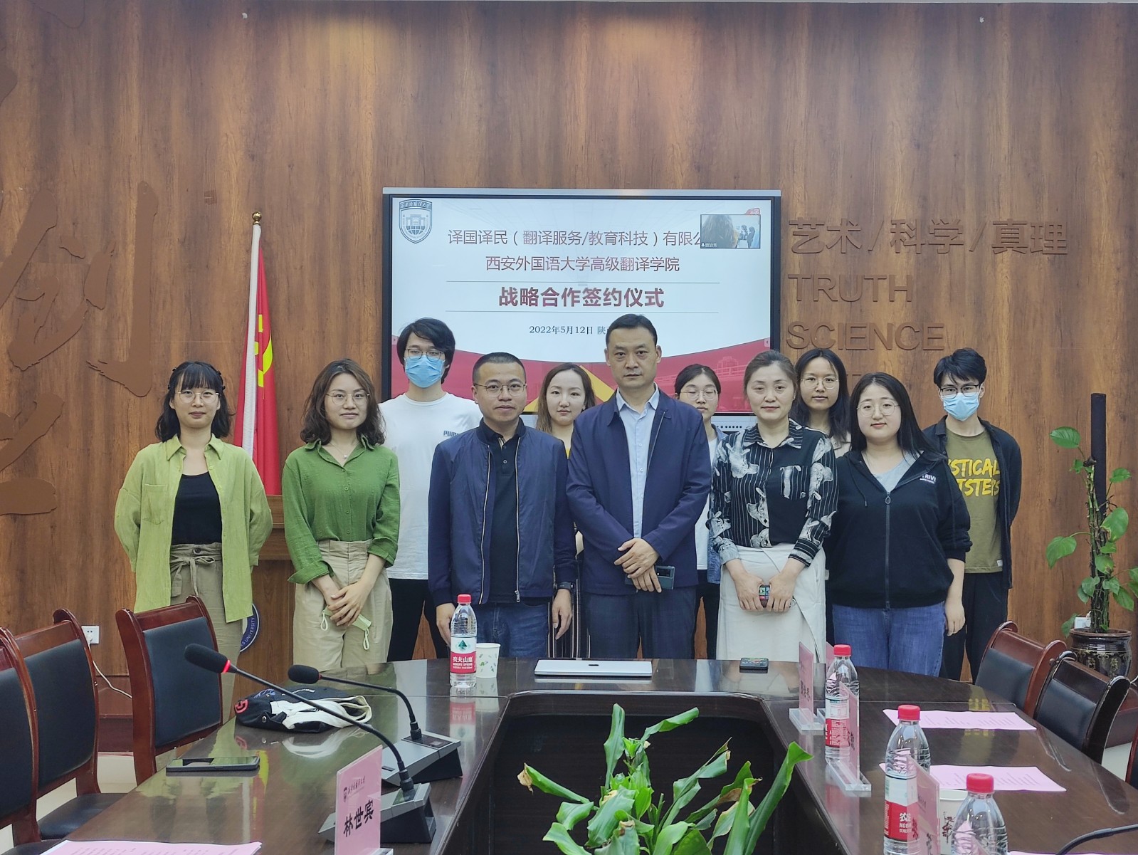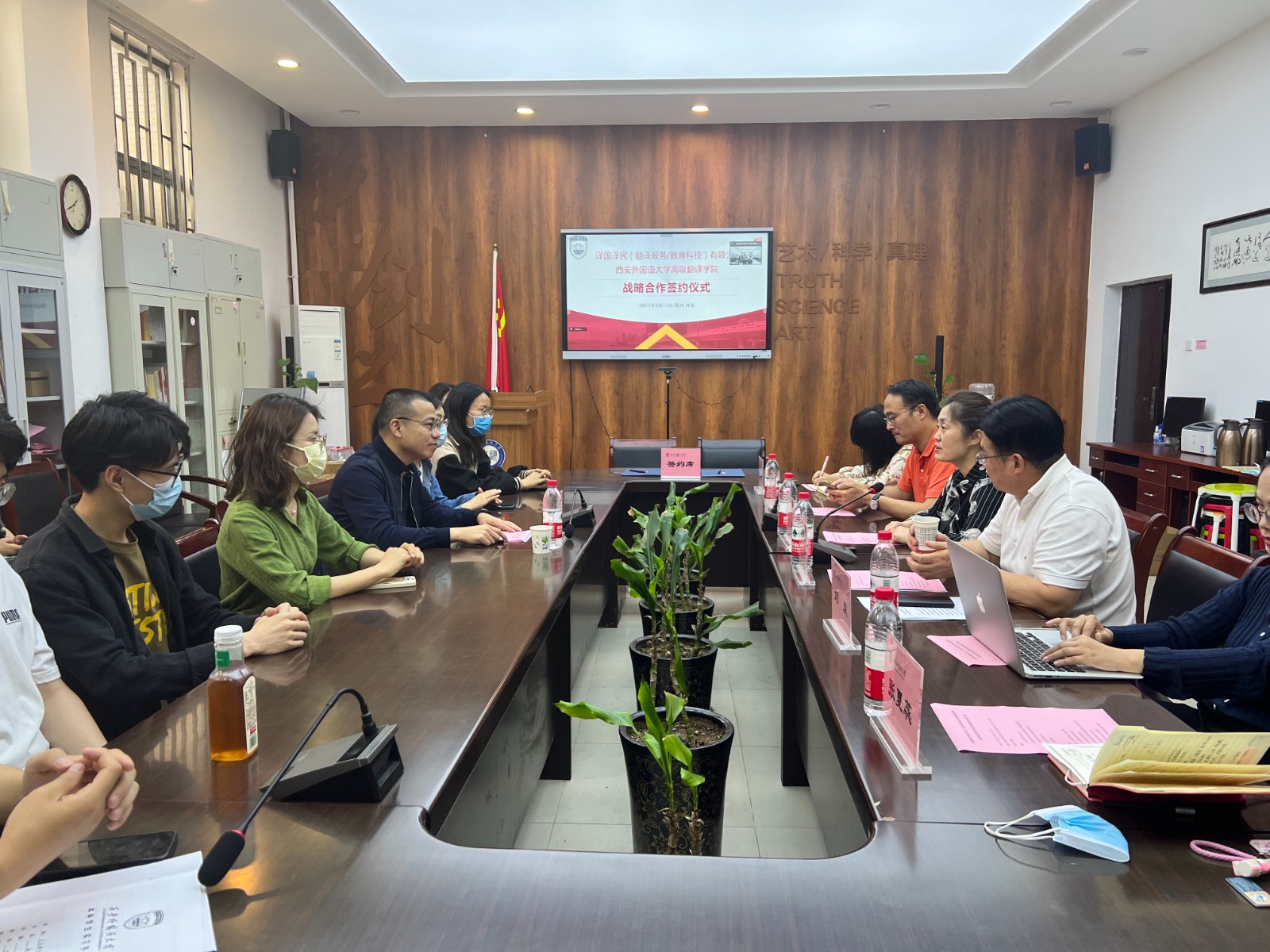 5月12日下午,上海译国译民公司总经理林世宾应邀来高级翻译学院交流访问,开展校企合作及学生就业洽谈工作并代表译国译民公司与我院正式签署战略合作协议。同时签署的还有双方共建陕西省CATTI(全国翻译专业资格考试)口笔译考试培训中心及CATTI口笔译考试实验班等执行协议。我校副校长吴耀武会前与林世宾亲切会谈。高级翻译学院党委书记樊花、副院长陈卫国及相关教职人员和部分毕业生线上线下参会。会议由副院长陈卫国主持。