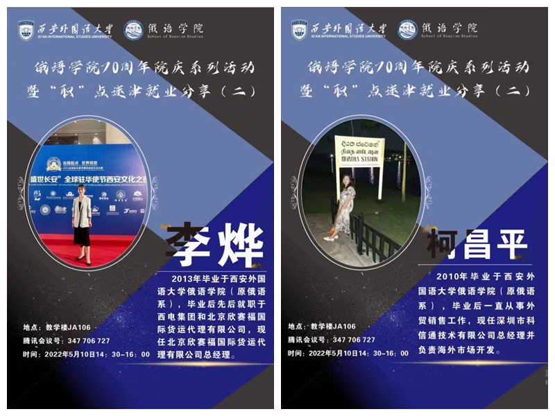 在校庆、院庆70周年来临之际,俄语学院盛情邀请优秀校友企业家返校,与同学们分享职场经验,帮助同学们树立良好的就业观念,了解市场环境。5月10日,俄语学院邀请北京欣赛福国际货运代理有限公司总经理李烨与深圳市科信通技术有限公司总经理柯昌平两位校友为同学们开讲,学院本科、研究生共计百余人通过线上线下方式参与,活动由研究生辅导员姜毅影主持。