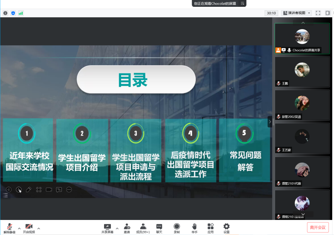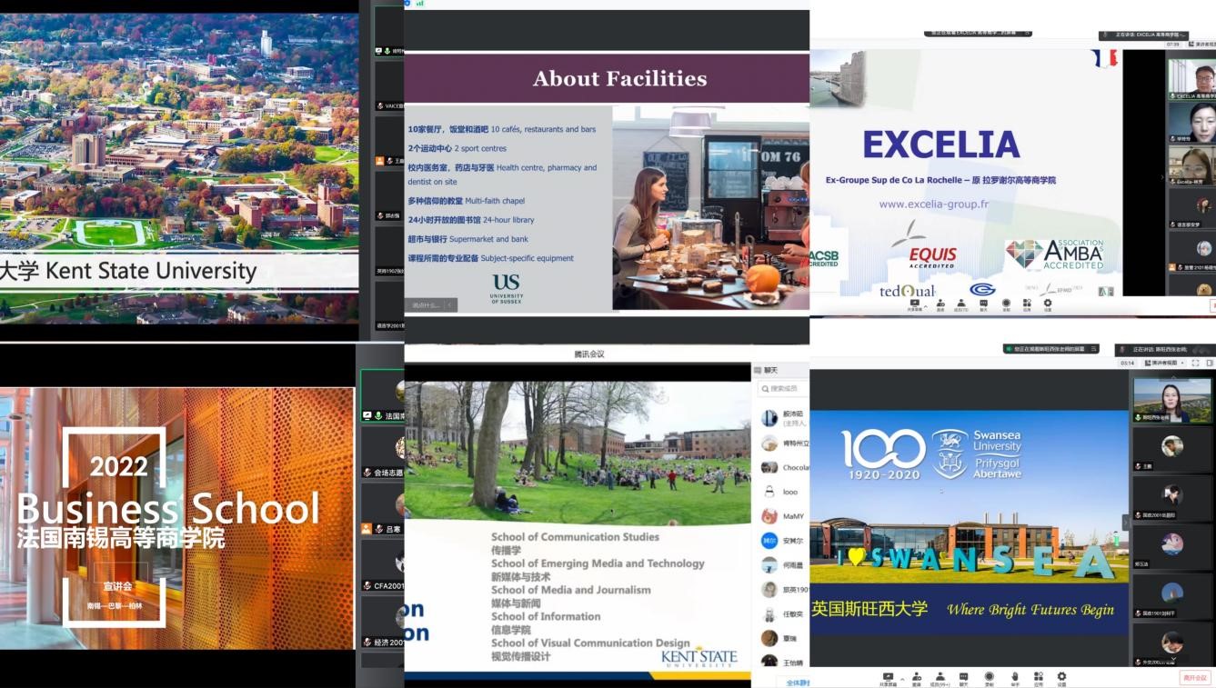 同时,在5月17日-5月20日期间,英国萨塞克斯大学、英国斯旺西大学、美国肯特州立大学、法国南锡高等商学院、法国EXCELIA高等商学院等我校友好合作院校的中国区项目主管,分别为我校教育类、口笔译类、新闻与传媒类、艺术类、管理类、国际关系类专业学生作了共10场各专业留学项目专场介绍,从学校概况、专业设置、学术氛围、食宿生活、奖学金等方面为各专业学生作了详尽说明。在场学生踊跃咨询,就后疫情时代国际交流途径与主讲老师进行了深入探讨,参会学生纷纷表示,对各自专业可申报留学院校有了更深入的了解。